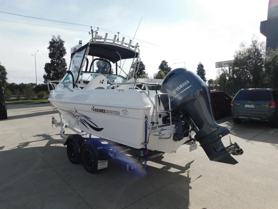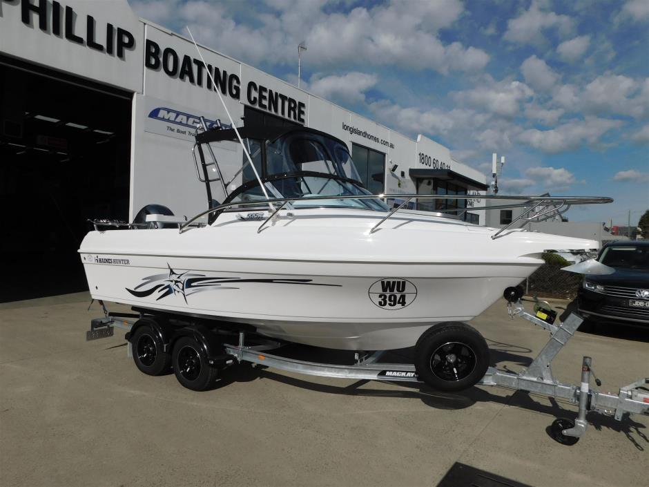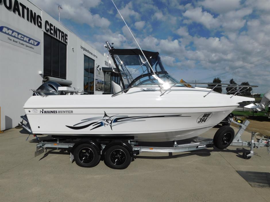 All New <br>2026 HAINES HUNTER 565R.<br>2026 Yamaha F150XC ,703 controller & 2 x 6Y8 gauge kit.<br>2026 Mackay MLJ5250T-13-M C-channel trailer. 2200kg rated. <br>Packed with standard factory & Limited edition features.<br>STANDARD FACTORY FEATURES:<br>• Anchor Drum Winch. Incl Rope & Chain<br>• Automatic Bilge Pump<br>• Bow Eye and Rear Tow Eye<br>• Bow Roller<br>• Bow Sprit<br>• Cabin Bulkhead<br>• Cabin Bunks c/w Bunk Cushions and Stowage<br>• Cabin Deck Hatch<br>• Cabin Side Shelves<br>• Curved Windscreen<br>• Deluxe Bucket Seats with Pedestal x 2<br>• Drink Holder x 2<br>• Ergonomically Designed Dashboard<br>• Lockable Glove box<br>• Moulded Side Pockets with Rod Storage<br>• Mechanical Steering<br>• Navigation Lights<br>• Passenger Grab Rail<br>• Port Side Storage<br>• Recessed Rear Cleats<br>• Rod Holder x 4<br>• Self Draining Anchor Well<br>• Sports Steering Wheel<br>• Single Bait Tank<br>• Underfloor Foam<br>• Underfloor Fuel Tank with Deck Fill & Breathers<br>• Underfloor Stowage Locker<br>• Upholstered Cabin Back Rests<br>• Water Resistant Switch Panel with Circuit Breakers<br>Factory fitted options in example price below:<br>32mm Stainlees steel bow rail<br>32mm Stainless steel rocket launcher<br>Bimini top only<br>Hydraulic steering<br>Basic package as listed.. $104,320 inc GST<br> <br>**ENQUIRE TODAY ABOUT AVAILIBLE STOCK**<br>Call Dan or Phil Today <br>Visit showroom to see our range Haines Hunter, Yamaha, Mackay products, <br>We are agents for Haines Hunter, Yamaha Outboards, Mackay Trailers, Yamaha Motor Finance, Yamaha Marine Insurance<br>We sell new/used boats, motors, trailers, boating accessories & spare parts..<br>Service / Repairs to Haines Hunter, all brands of Fibreglass & Alloy boats. <br>Service and Repairs on most 2 & 4 stroke motors.<br>Trade In's & consignment welcome.<br>Transport can be arranged Australia wide.<br>**PHOTOS NOT OF ACTUAL BOAT**<br>**OPTIONS MAY VARY FROM PACKAGE DESCRIPTION**